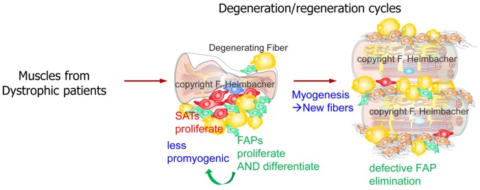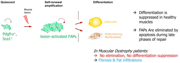 Little is known on the mechanisms suppressing FAP differentiation in time and space. Interestingly, fibrosis and adipose infiltrations (products of FAP differentiation) are symptoms common to several muscular dystrophies [7, 8]. Thus, irrespective of their respective genetic cause, these pathological contexts lead to unleashed FAP differentiation and defective elimination. Preventing fibrosis has become a major goal in the field of muscle pathologies, with emphasis on inhibition of the TGFβ pathway as the leading known fibrosis inducer. To this aim, a key unmet need is to identify naturally occurring mechanisms that block fibro-adipogenic differentiation in healthy muscles, and to understand what is altered in pathological contexts.