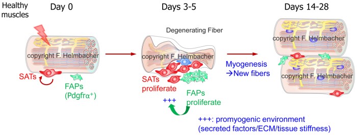 Skeletal muscles are capable of regenerating after damage. This is possible owing not only to myogenic stem cells (MSCs), from which new myofibers originate, but also to several non-myogenic cell types resident in muscles. Among these, fibro-adipogenic progenitors (FAPs) are known progenitors of tissue-fibroblasts/myofibroblasts and adipocytes. FAPs, are quiescent in healthy muscles, but are triggered to proliferate in situation of muscle damage, resulting in a transient fibrosis, during which they positively influence the myogenic repair process [1, 2]. Besides secreting pro-myogenic factors, FAP activation/expansion enables the transient production of extracellular matrix (ECM), which provides the adequate tissue-stiffness for MSCs to undergo myogenic differentiation [3, 4].