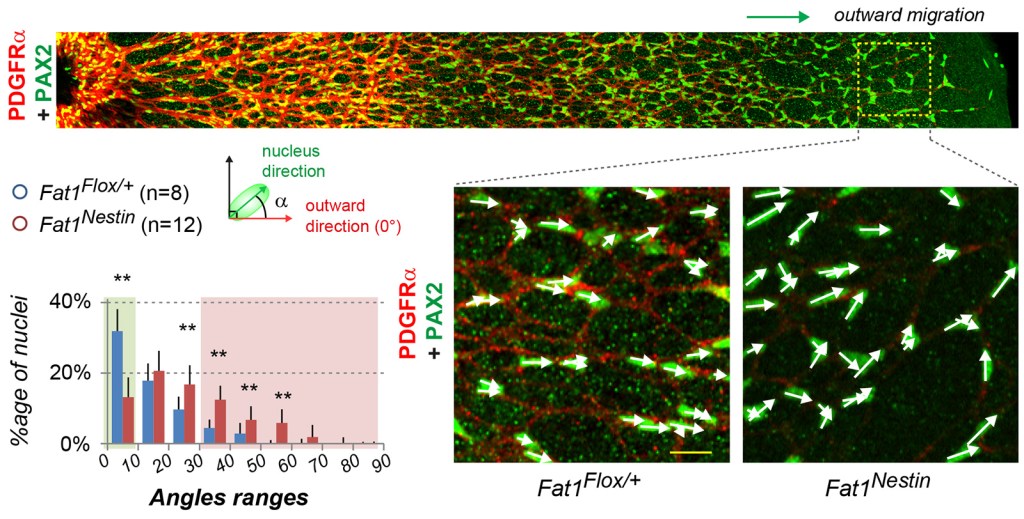 Astrocytes migrate collectively in a polarized manner, headed in a radial/outward direction [3]. This represents a fascinating example of planar polarized migration, raising the possibility that pathways controlling planar cell polarity or polarized migration could interfere with astrocyte progression and likewise with retinal angiogenesis. Our new study shows that one such regulator of tissue morphogenesis, the FAT1 cadherin, influences retinal vascular development by modulating astrocyte migration polarity and maturation [4].