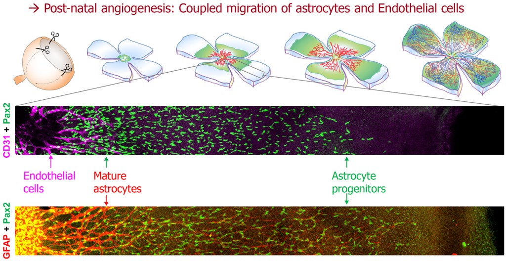 Endothelial cells (ECs) are the buidling blocks of blood vessels, which assemble and grow through a process called angiogenesis [1]. The mechanisms of angiogenesis are common to many organs. However, some organ-specific adjustments require that ECs cross-talk with organ-specific cellular players. The retina is an excellent example of such interactions between ECs and organ-specific cell types such as astrocytes or neurons [1, 2].